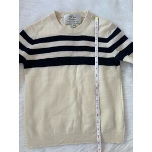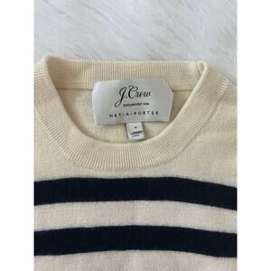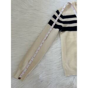 Stylish crew neck sweater. Cream base with bold black stripes. Perfect for casual wear.