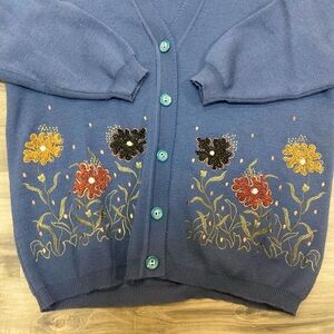 This stylish blue cardigan features intricate floral designs, adding a touch of elegance to any outfit. Perfect for both casual and formal occasions.