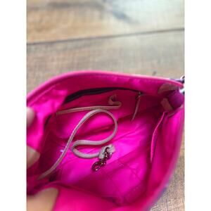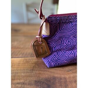 This Dooney & Burke 90s mini shoulder bag is in excellent pre-loved condition! No rips or stains. This purse has a swirl design in pink and a purplish navy tone. There is a cute bag charm on the end of the bag, too. The inside is very clean!! Measurements in the photos.