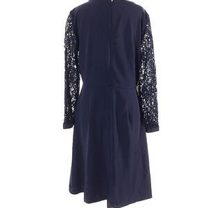 Navy crepe fit and flare dress with unlined lace sleeves, size 2 from Loft.