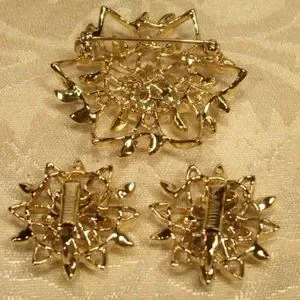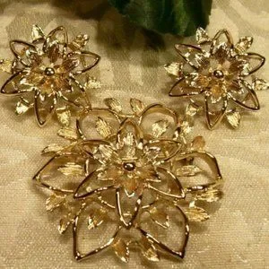 Elegant floral brooch set by Sarah Coventry. Features intricate gold-tone design. Perfect for adding a touch of elegance.