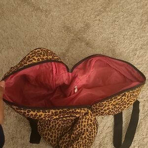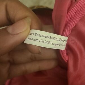 Features: two thick black straps, one exterior pocket, pink interior, easy wipe material (100% cotton exterior), bright pink interior looks to be a nylon type material, easy to clean