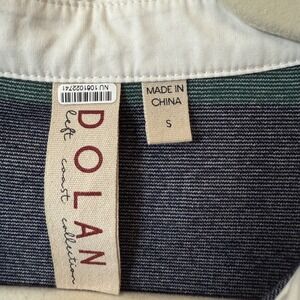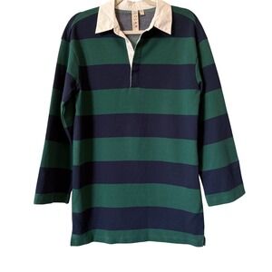 Keywords: rugby shirt, long sleeve top, striped shirt, green and blue shirt, womens top, Dolan Left Coast, casual shirt, preppy style, collegiate, S, size small, relaxed fit, green stripe, blue stripe, collared shirt
