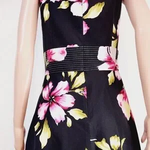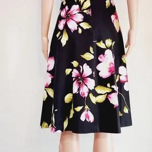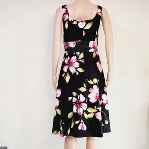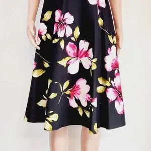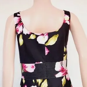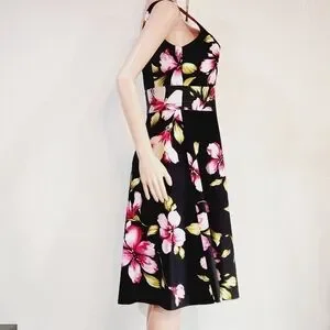 Donna Ricco New York Tropical Floral Hibiscus Print Sleeveless Sundress. This is a super cute dress with a black background and a floral print is perfect for a vacation or cruise. Very well made and unique! Fully lined. Underskirt has tulle around the bottom to add to the skirt's fullness. 97% cotton, 3% spandex. Excellent quality and condition, no flaws.
