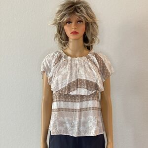 Show Me Your MuMu Bungalow Top. Size Small. 100% polyester. Hand wash, hang dry or dry clean. Measurements taken lying flat and are approximate: chest armpit to armpit 17.5”, length from top to bottom hem 20”. Smoke free home. Weighs 7 ounces for shipping.