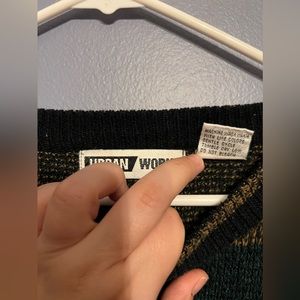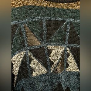 Vintage Urban Works sweater in men’s Large. Front triangles have a few that are faux leather. Material is 100% acrylic with leather trim.