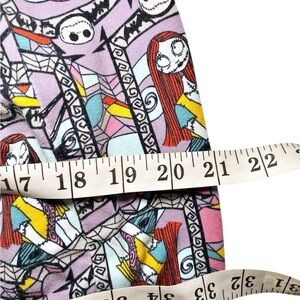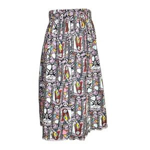 This is a high-waisted, A-line skirt with a gathered, elastic waistband. The fabric has a playful, all-over print featuring characters from the movie "The Nightmare Before Christmas," specifically Jack Skellington and Sally.