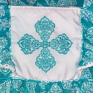Smocked Sweets 2T Bubble Romper Turquoise Blue White Embroidered Cross. cross print on bodice. Smoke free home. Weighs 5 ounces for shipping.
