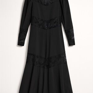 Chic black dress with long sleeves. Features lace accents. Ideal for stylish outings.