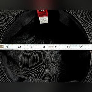 This elegant black wide-brim hat is perfect for any occasion. Its sleek design adds a touch of sophistication to your outfit. 7.5" inside diameter ... outside diameter is 16.5"