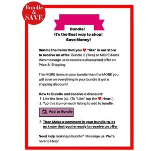 BUNDLE with other items to save on shipping (Add items to your Bundle by tapping the “+” shopping bag at the bottom of the listing) If you want to receive a Special Bundle Offer on both the Price and on Shipping then Create a bundle with TWO (2) or more items. THEN leave us a message in the bundle so we know that you are ready for an offer If you need help on how to bundle, please ask. We’re here to help