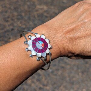 Authentic Native American Sun Face Inlay Cuff Sterling Silver Bracelet Sz 7 in.*