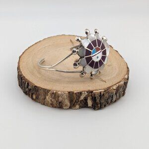 A beautiful Zuni Sun Face Inlay Cuff Bracelet. Made with mother of pearl, charoite, turquoise, coral and jet. Sterling silver split shank band with ball accents around the Sun Face. Elegant and beautiful Southwestern collectible jewelry. Handcrafted by Artisan, Diane Lonjose, a member of Zuni tribe. This piece was directly purchased at the Zuni Pueblo, southwest US.