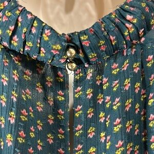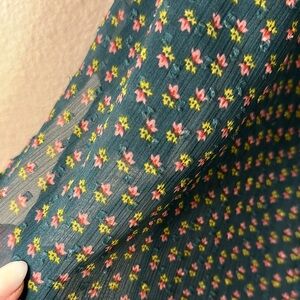 Sheer green fabric is overlaid with a beautiful sheer green and pink floral Swiss dot fabric for this classy and timeless sleeveless blouse. The back of the high neck is adorned with goldtone metal buttons. P2P is 20”, nape to hem is 26”.