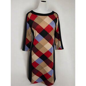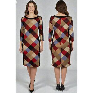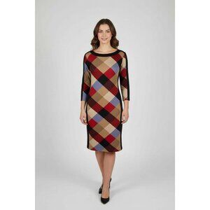 Stylish Nine West sheath dress featuring a bold multicolor geometric plaid print. Mid-length with 3/4 sleeves, flattering silhouette, and soft stretch fabric. Perfect for work, events, or elevated everyday wear.