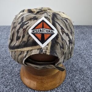 Camo cotton baseball cap featuring embroidered MaxxPro armored vehicle on front and International Harvester logo patch on back. Made by KC Caps, Cambodia. Good vintage condition with clean fabric, crisp embroidery, and adjustable strap. Unique promotional or industry branded item ideal for military enthusiasts, truck collectors, or Auto-International fans.