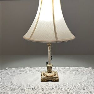Illuminate your space with this elegant cream table lamp. Its classic design adds a touch of sophistication to any room. Shade has a few small stains. Wt 2.5 lbs.
