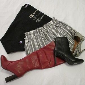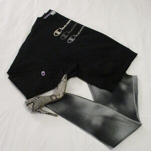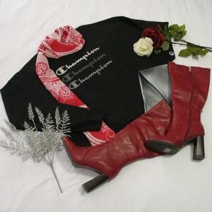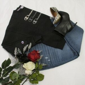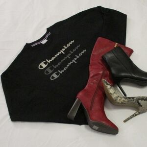 Very nice black sweatshirt with triple CHAMPION BRAND NAME on front: Silver Grey Sparkle, Dark Grey, and Medium Grey. The top brand name logo is sparkle shimmer; Medium weight. This sweat can go with any color. Leggings, Jeans, Shorts or Denim Skirts (you can wear opaque tights during winter or for cooler weather if desired), Boots, Shoes, Shorts, Jackets, and Accessories, are in listings as well. Crew neck: embroidered logo on lower left sleeve. Will fit small to large based on measures and desire for fit (generous in size). Wear baggy or fitted.
