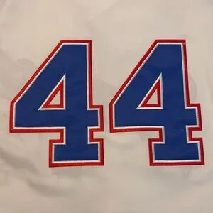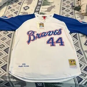 Classic Braves jersey with bold number 44. Features red and blue accents. New with tags, never wore it because it's loose fitting more like an XL-MAKE ME AN OFFER!!!