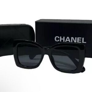 Sophisticated CHANEL sunglasses with black frames and gold accents. Perfect for a luxurious touch.