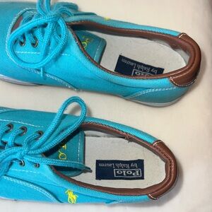 Vintage Polo by Ralph Lauren canvas sneakers in a gorgeous aqua blue with brown leather trim. Classic low-top lace-up style from the mid-2000s. Women’s size 6.