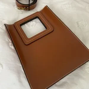 STAUD Tan Leather purse with Square Handle and crossbody strap