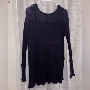 Slouchy + cozy! Free People waffle-knit sweater with a relaxed, longline fit and raw/distressed edges. Features a scoop neckline, extra-long sleeves, exposed seams, and a wavy/uneven hem for that lived-in FP vibe. Perfect with leggings, skinnies, or shorts.
