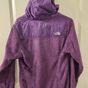 Warm fleece by The North Face. Features a hood and front zip. does have a little discoloration on top zipper and inside. size medium