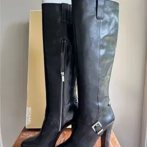 Chic black heeled boots by Michael Kors. Features sleek silver buckle and zipper details. Perfect for elevating any outfit.