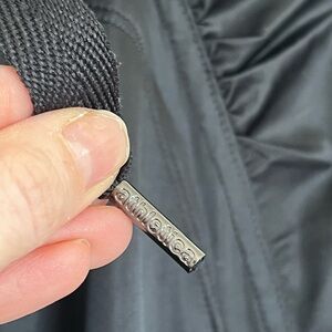 Description: Rare poncho style capelet with hooded, water repellant sateen fabric, full zip, adjustable drawstrings through out