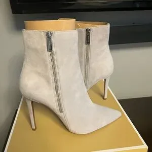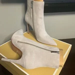 Chic light gray suede boots with sleek zipper detail. Elevate your look effortlessly.