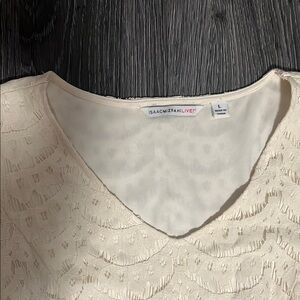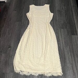 This stunning cream maxi dress by Isaac Mizrahi is designed with a sleeveless cut and a scoop neckline, perfect for a wedding or cocktail occasion. The sundress style offers a breezy and elegant look, ideal for a bride or wedding guest seeking a timeless and romantic appearance.