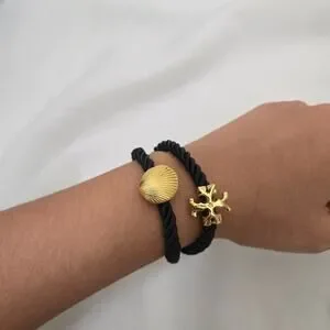 This brand new bracelet features the iconic Tory Burch shell logo, beautifully crafted with 18K gold plating. The black rope detail adds a bold, summery touch, perfect for beach days or adding a chic accent to any outfit.