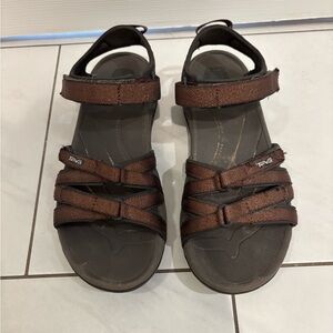 Stylish dark brown sandals by Teva. Features adjustable straps for a secure fit.
