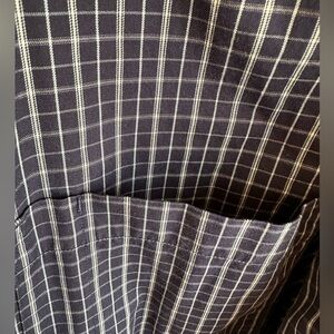 No stains, tears, rips or holes. Blue and white with small checkered pattern. Button down collar, chest pocket with built in pencil/pen holder. Center back box pleat.