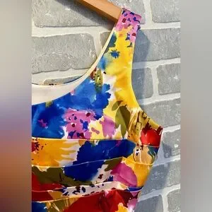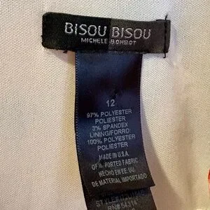 Brighten your look with this Bisou Bisou cocktail dress. Features bold floral patterns in red, pink, yellow, and blue. Perfect for a lively outing. Size 12 excellent condition.