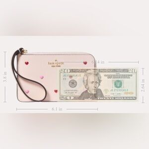 NWT Kate Spade Lucy Heart Studs Small L-Zip Wristlet – the perfect mix of cute and chic! Crafted in pink leather with heart stud detailing, this compact wristlet adds a flirty, polished touch to any look. Features a secure L-zip closure, a detachable wrist strap, and a Kate Spade logo plaque. Perfect for carrying essentials like cards, cash, and keys — whether you’re running errands, heading to brunch, or out for date night.