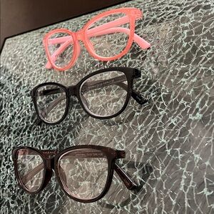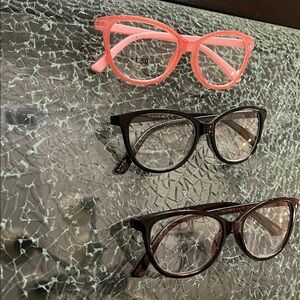 Set of three stylish eyeglasses. Includes pink and black frames. Perfect for any occasion. New with out box