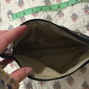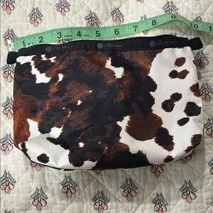 Chic LeSportsac pouch with a cow pattern. Features dual zip compartments.