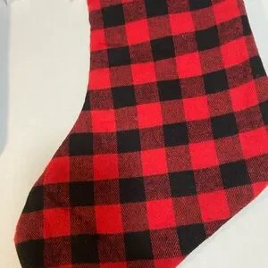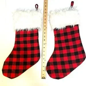 Festive red and black plaid Christmas stockings featuring white faux fur trim. Measures appx 18"L x &.5" W. Plenty of room for stocking stuffers. Both have loops for hanging. Preowned. Great condition. Never used.