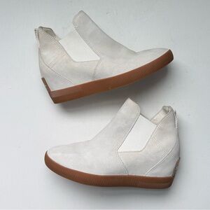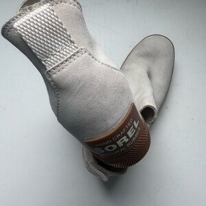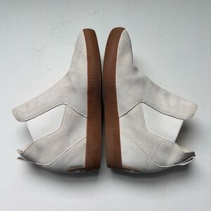Ceramic color. Waterproof suede upper. Slip on style with easy-on gore panels. Molded BPU wedge midsole. Removeable EVA footbed. Molded EVERTREAD rubber outsole for traction. 1 3/4 inch wedge heel. 4 inch shaft. 8 3/4 inch shaft circumference. Light wear and some dirt but overall excellent condition. 38.5/7.5.