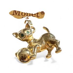 Adorable and rare vintage Monet cat pendant, dating to the 1960s–early 1970s. Features a playful kitty batting a gold ball, finished in rich gold-tone plating with sparkling green rhinestone eyes.