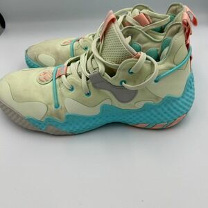 These are dirty and need washing but are structurally sound. Adidas Harden Vol 6 basketball shoes in a light yellow, blue, and pink colorway. These athletic shoes feature a supportive mid-top design with distinctive wavy sole detailing. The "BOOST" technology in the midsole provides responsive cushioning. Ideal for intense games on the court or casual streetwear style.