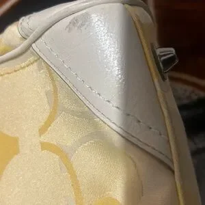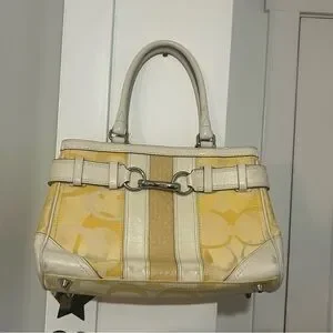 This stylish women's handbag features a beautiful combination of yellow and cream colors, perfect for adding a touch of elegance to any outfit. Its sophisticated design makes it a versatile accessory for any occasion.