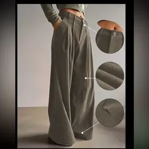 Stylish wide-leg corduroy pants. Features a button closure and pleated design. Perfect for a chic look.