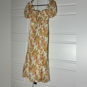 Hello Molly dress, size 2, NWT Hello Molly, floral midi dress, puff sleeve dress, white pink floral, brunch outfit, summer wedding guest, garden party dress, sweetheart neckline, romantic midi, cottagecore style, side slit dress
