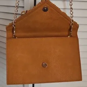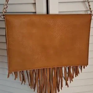 Faux leather envelope clutch with long front fringe and half-chain adjustable strap. Inside zipper pocket and 2 small pouches. Magnetic closure.