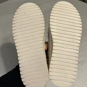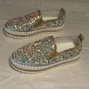 Womens sparkly iridescent sequin slip-on platform sneakers. The platform is white with a sparkling trim. Pull tabs in back for easy slip-on access. Size 40, US Size 8