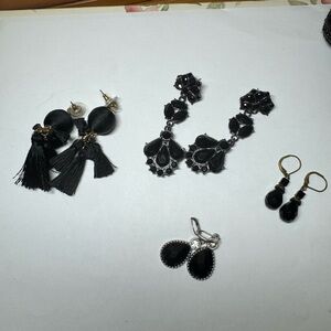Mix of dramatic black costume jewelry: big beaded statement bib necklace, gothic cross necklace, chunky double-strand black bead necklace, multi-strand seed bead cuff bracelet and 4 pairs of black earrings (tassel, long chandelier and simple drops). Perfect for party, gothic looks or to add a little drama to any outfit ✨