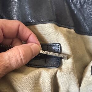 Chic Tory Burch tote in black leather. Features signature logo accent. Stylish and versatile for any occasion. Super cute gently used has a few stains inside might be able to get cleaned selling for a great price as is.